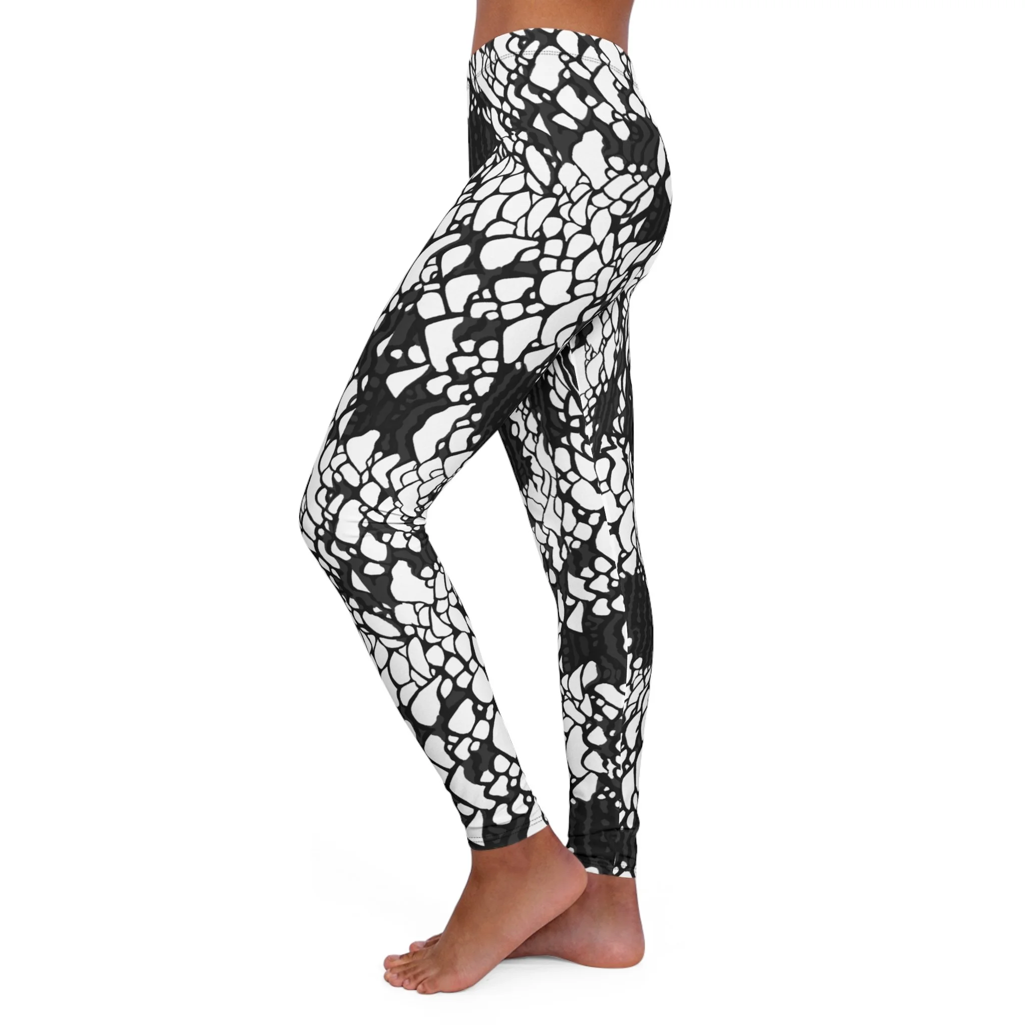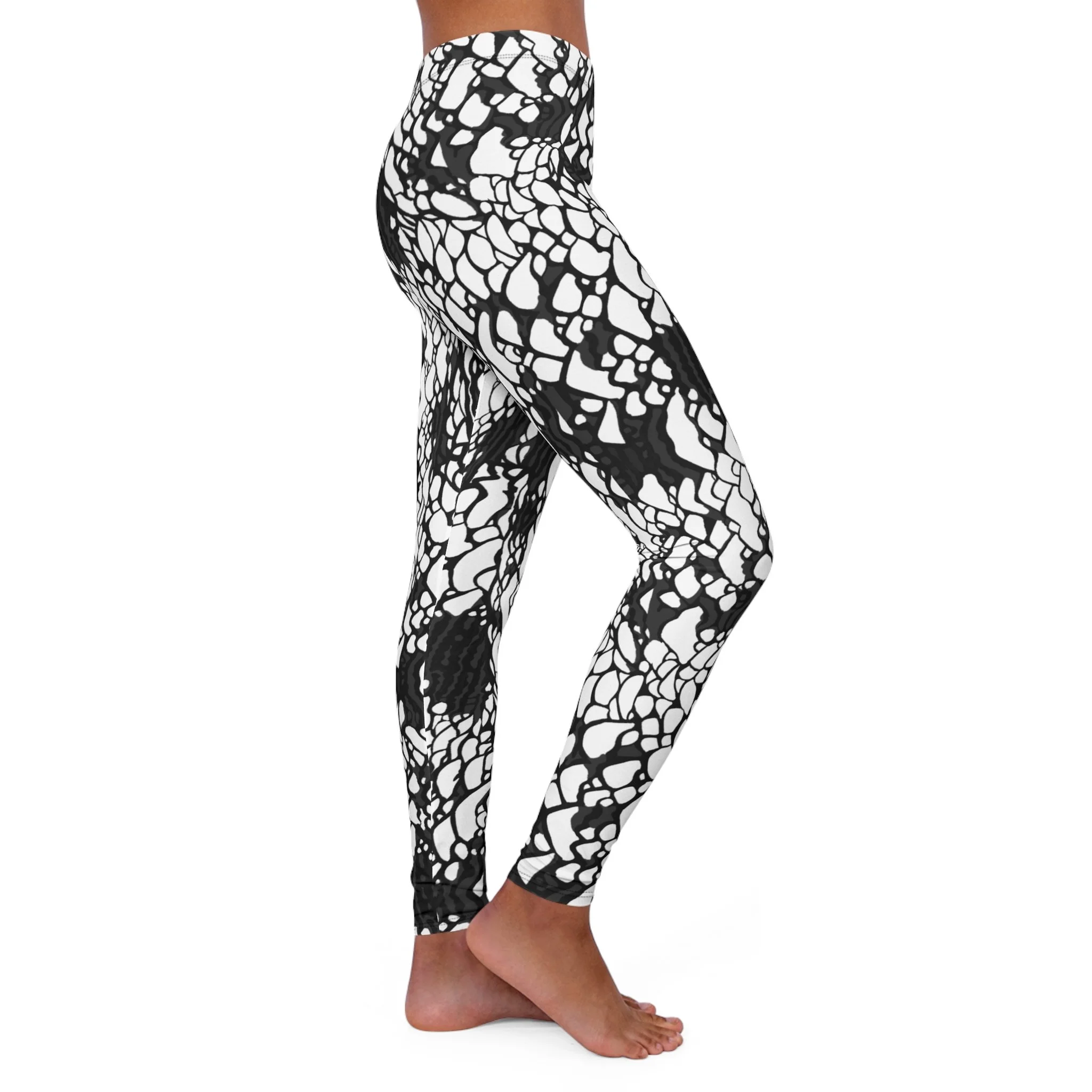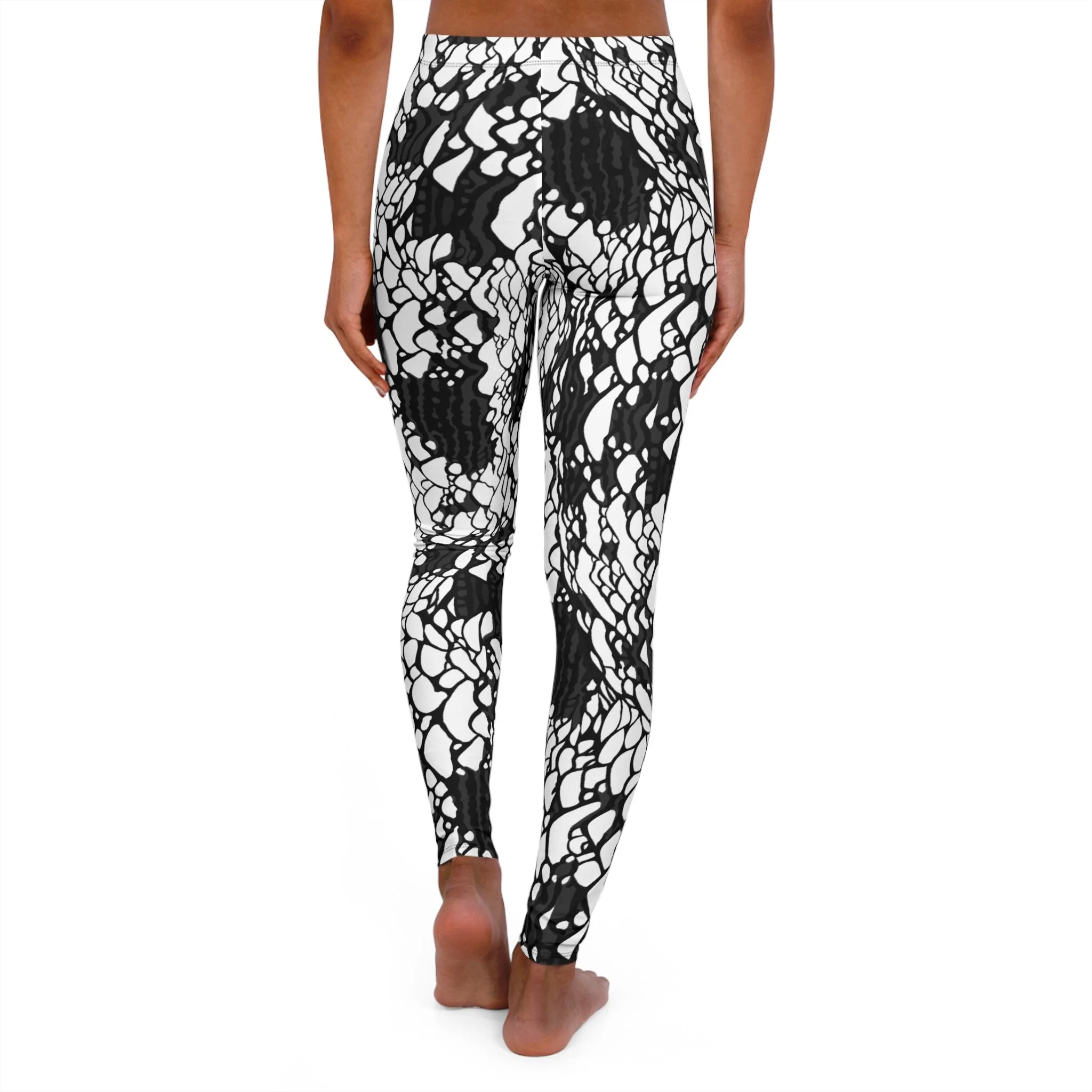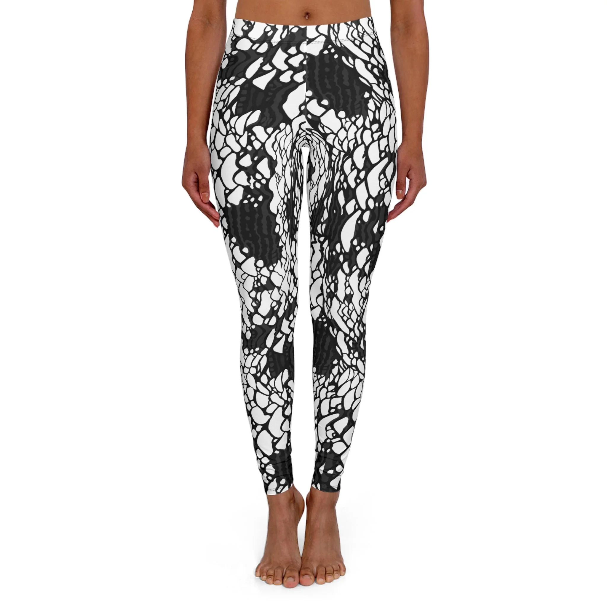 These skinny-fit leggings bring bold, hand-drawn contrast to everyday movement. The high-energy black-and-white pattern reads like abstract lace or inkblot art — graphic at a glance, intricate up close. They move with you thanks to 4-way stretch and a double-layer waistband that stays secure through yoga flows, studio sessions, or long coffee runs. Lightweight and soft from the polyester-spandex blend, they layer easily under tunics or pair with an oversized sweater for weekend errands. Subtle signs of construction — a black seam thread and sewn-in care label — keep the look polished while reminding you these are made to wear and wash. Assembled in the USA with global materials, they carry a small, lived-in character (slight see-through when fully stretched) that suits bold wardrobes and artists who favor statement neutrals.