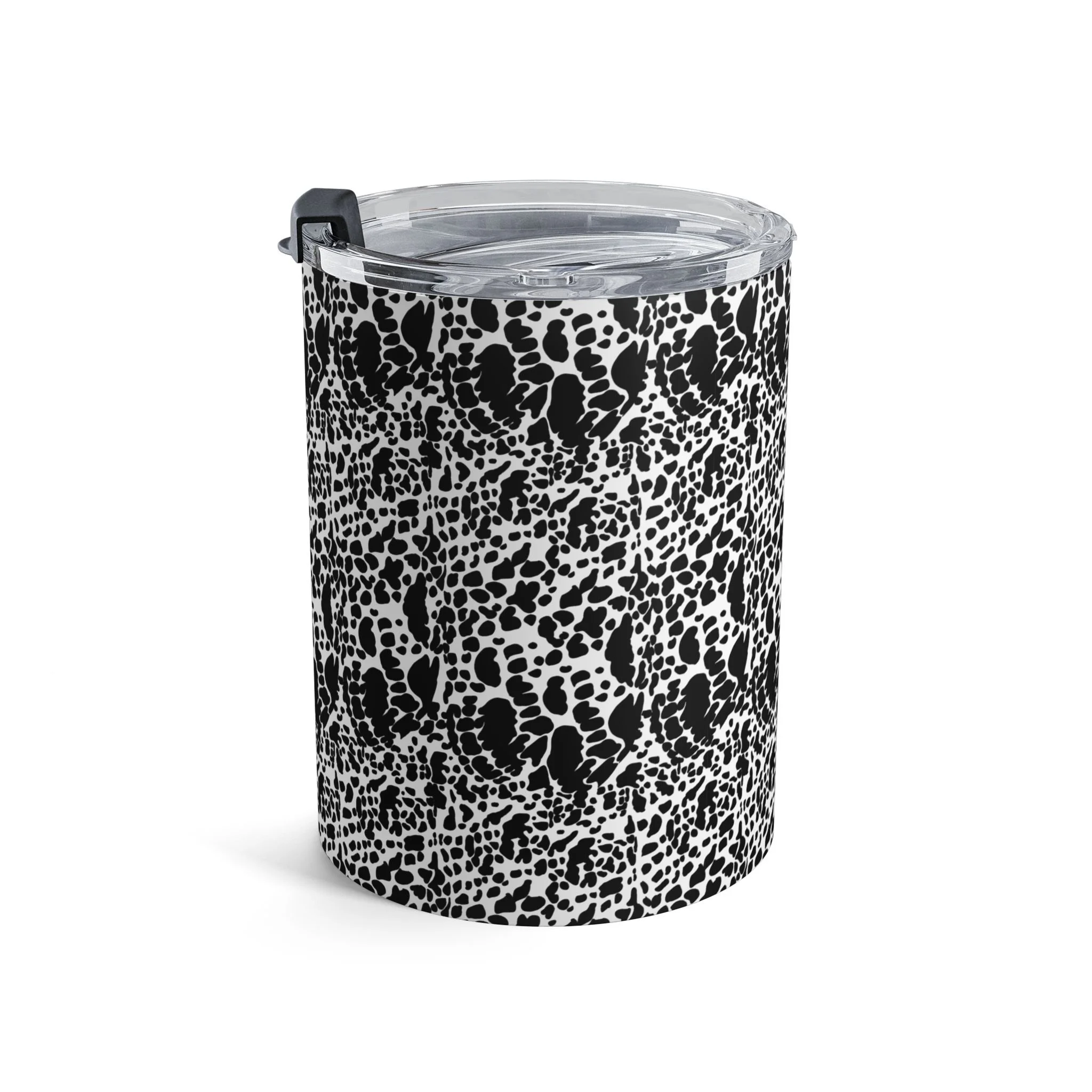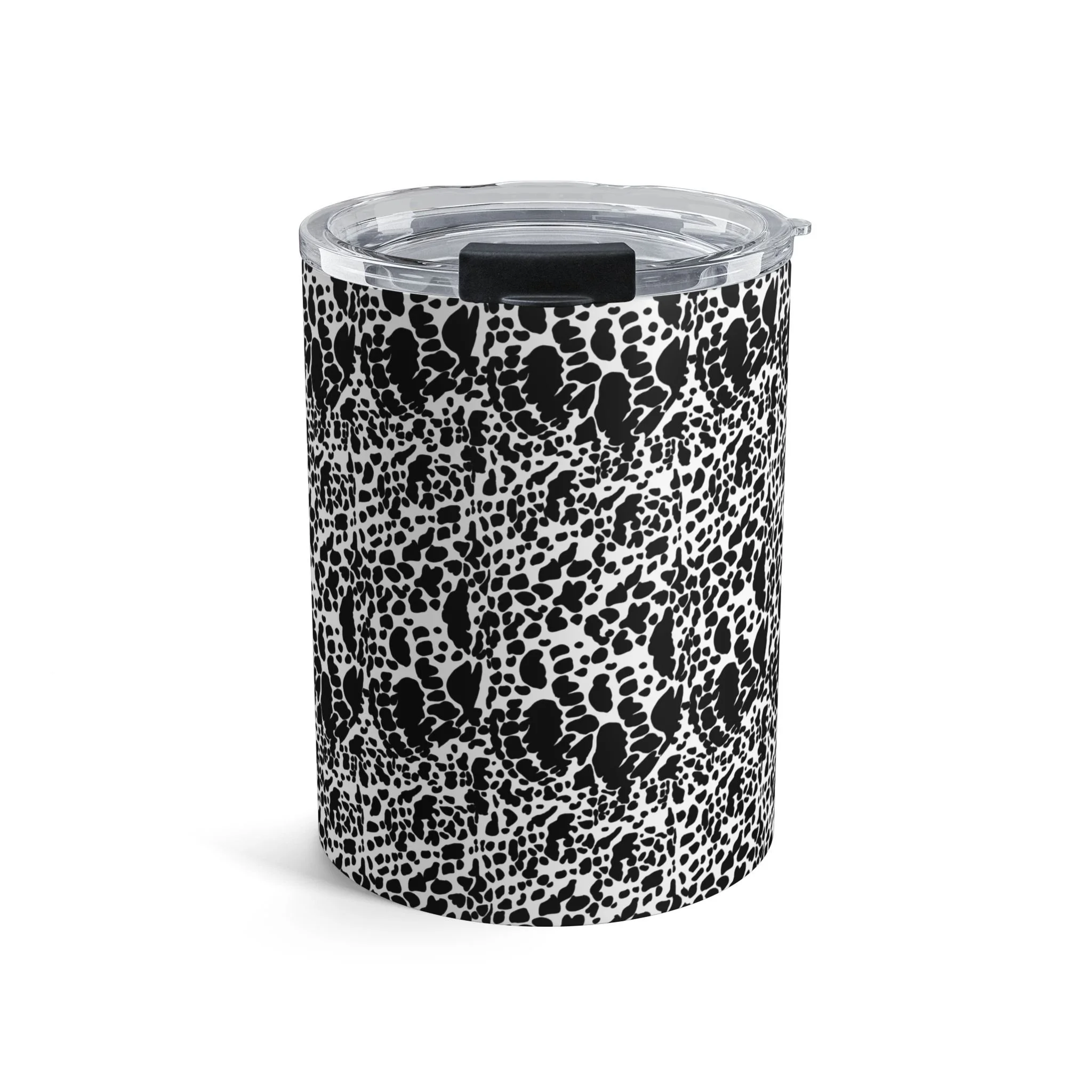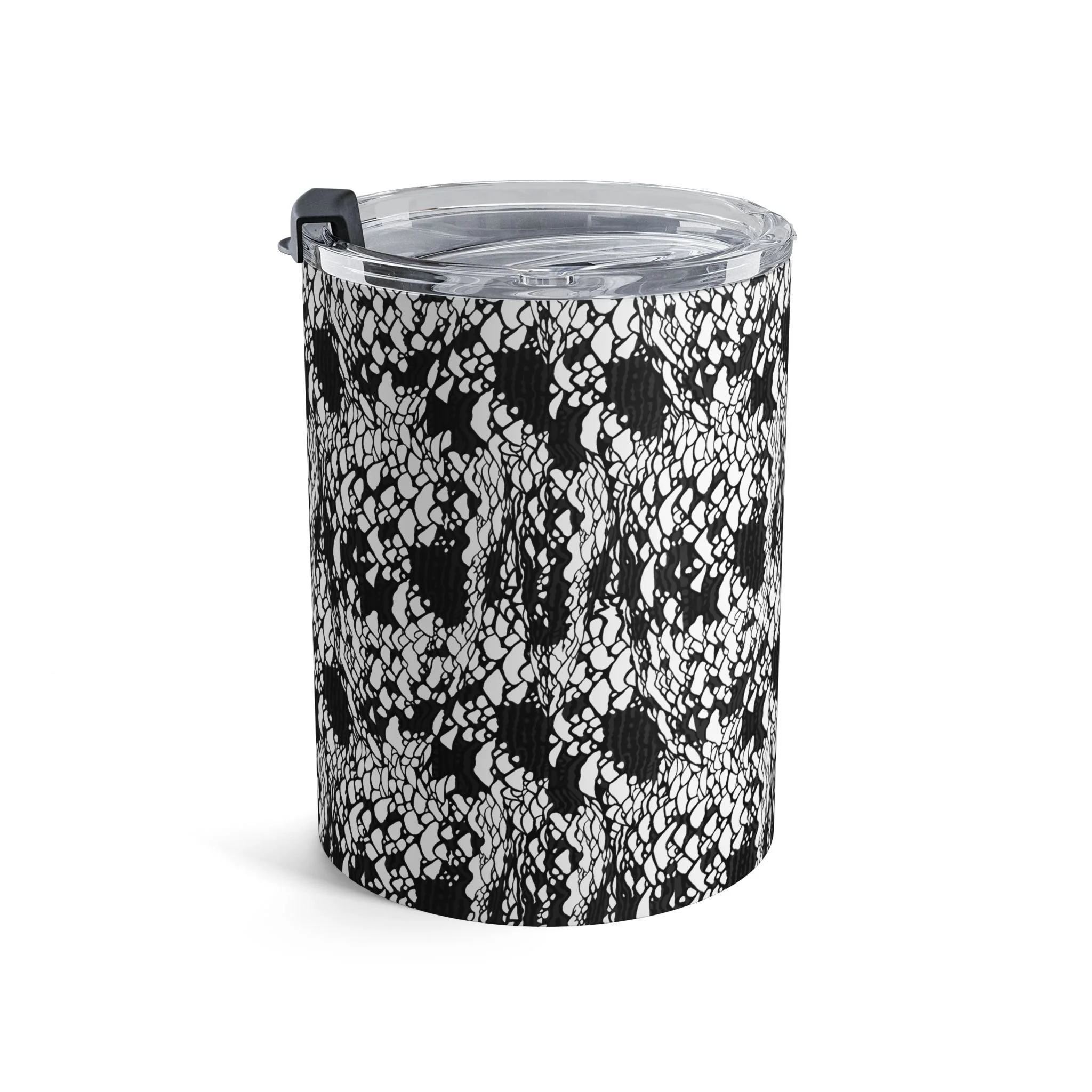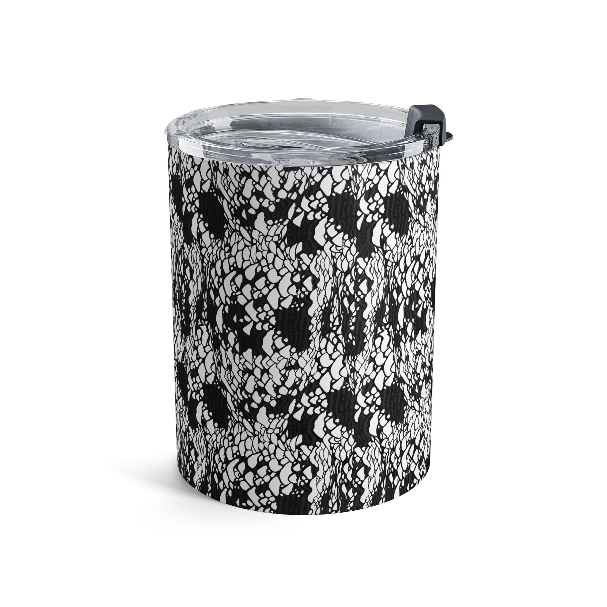 This 10oz stainless steel tumbler carries a bold black-and-white pattern that reads like hand-drawn lace or inked pebble textures. It feels compact in hand — a little daily companion that keeps your coffee warm through morning pages and your cold drinks crisp on a midday walk. The clear push-on lid with rubber gasket seals in temperature and minimizes spills, while the rounded edges and slim profile slip easily into small bags and tote pockets. It’s for people who savor quiet rituals: sketchers, commuters with an eye for monochrome design, and anyone who likes their carry to be both functional and visually distinct. Use it during early studio mornings, on crowded transit rides, or as a calm presence on your home desk.