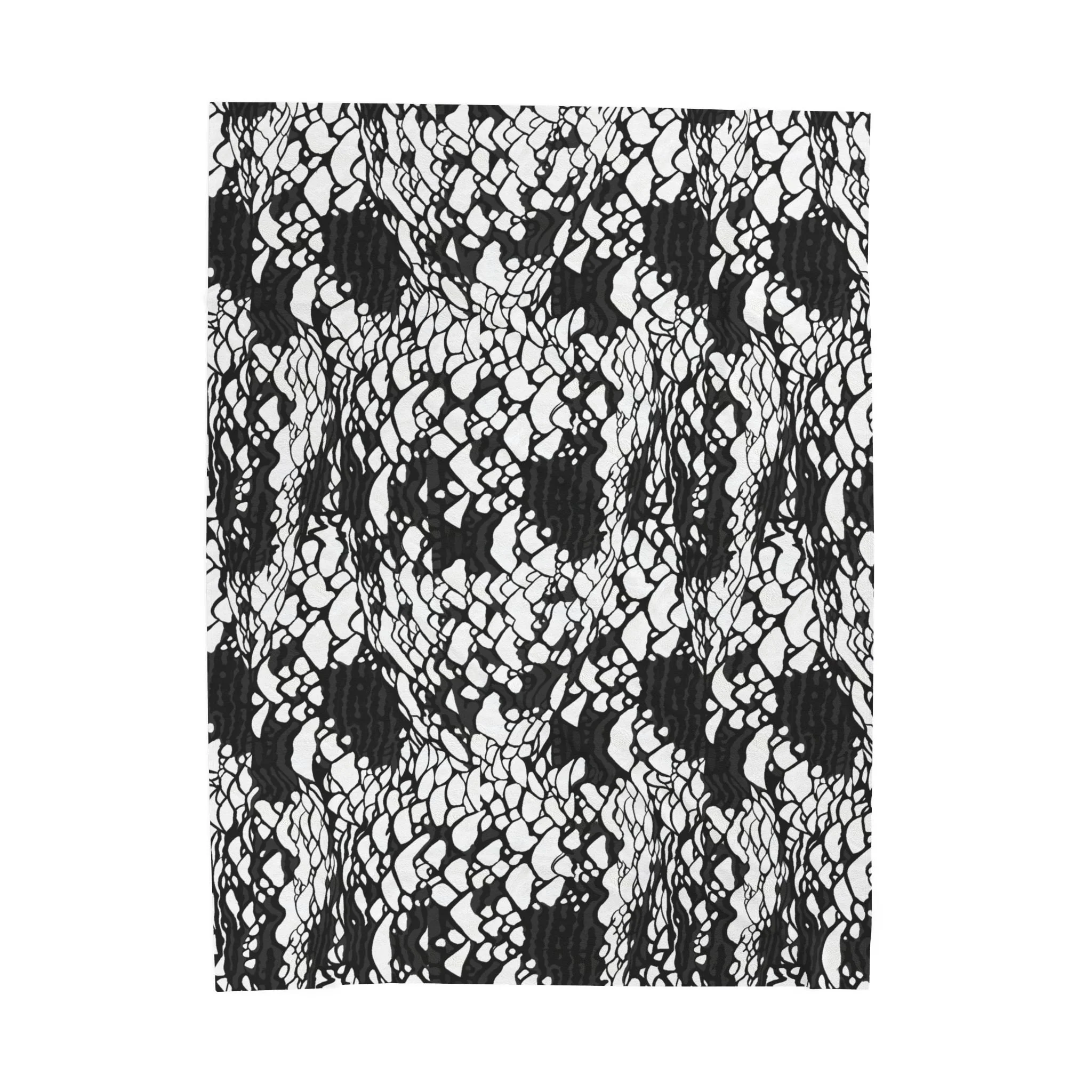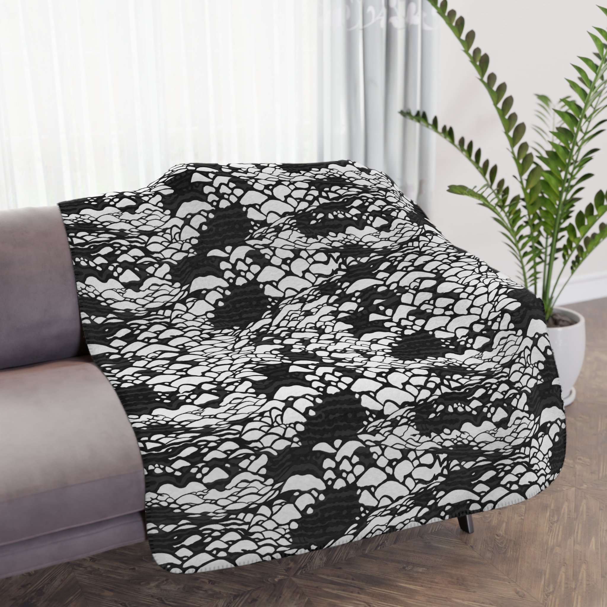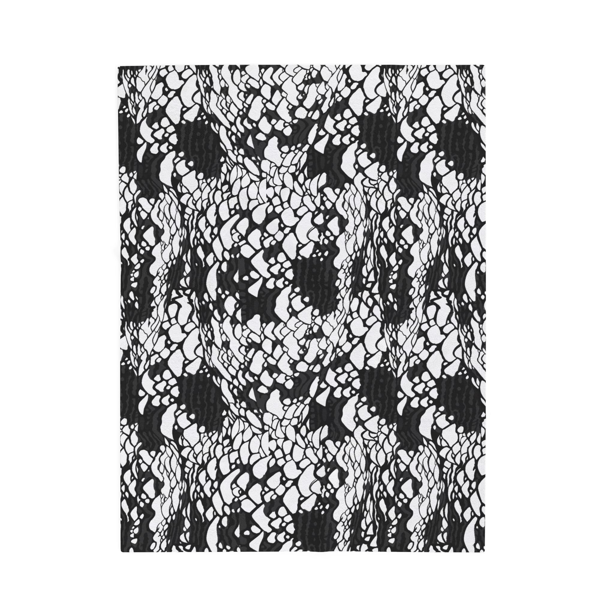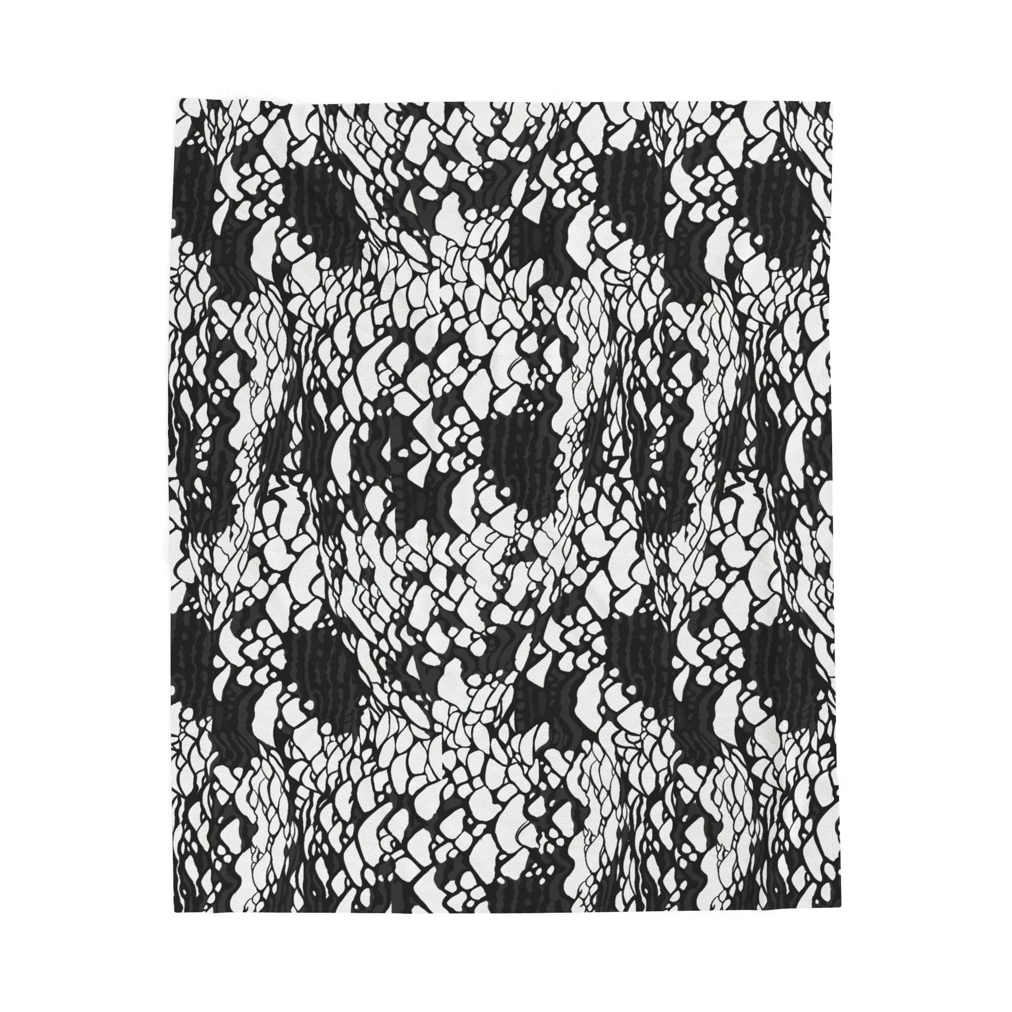 This plush velveteen microfiber blanket wraps a room in quiet, graphic calm. The two-sided print features an organic, black-and-white lace-like pattern—at once modern and slightly bohemian—so it reads as texture from across the room and reveals intricate marks up close. Lightweight yet cozy, the blanket drapes over sofas, folds into reading nooks, or layers at the foot of a bed to add contrast and subtle movement to neutral decor. It’s designed for everyday use: the hemmed edges and stitched border keep the shape tidy, while the soft, velvety face invites lingering and slow moments with a book or morning coffee.