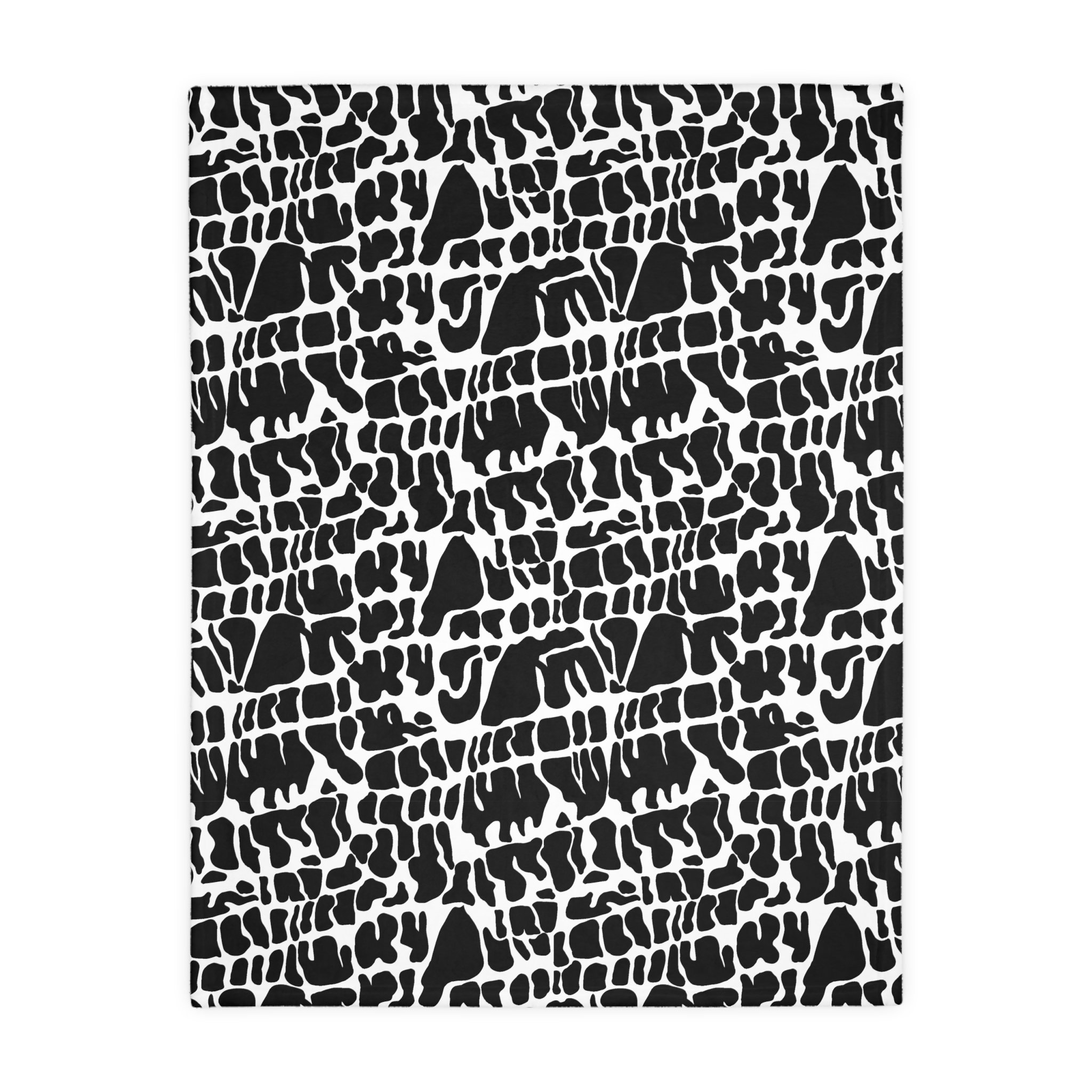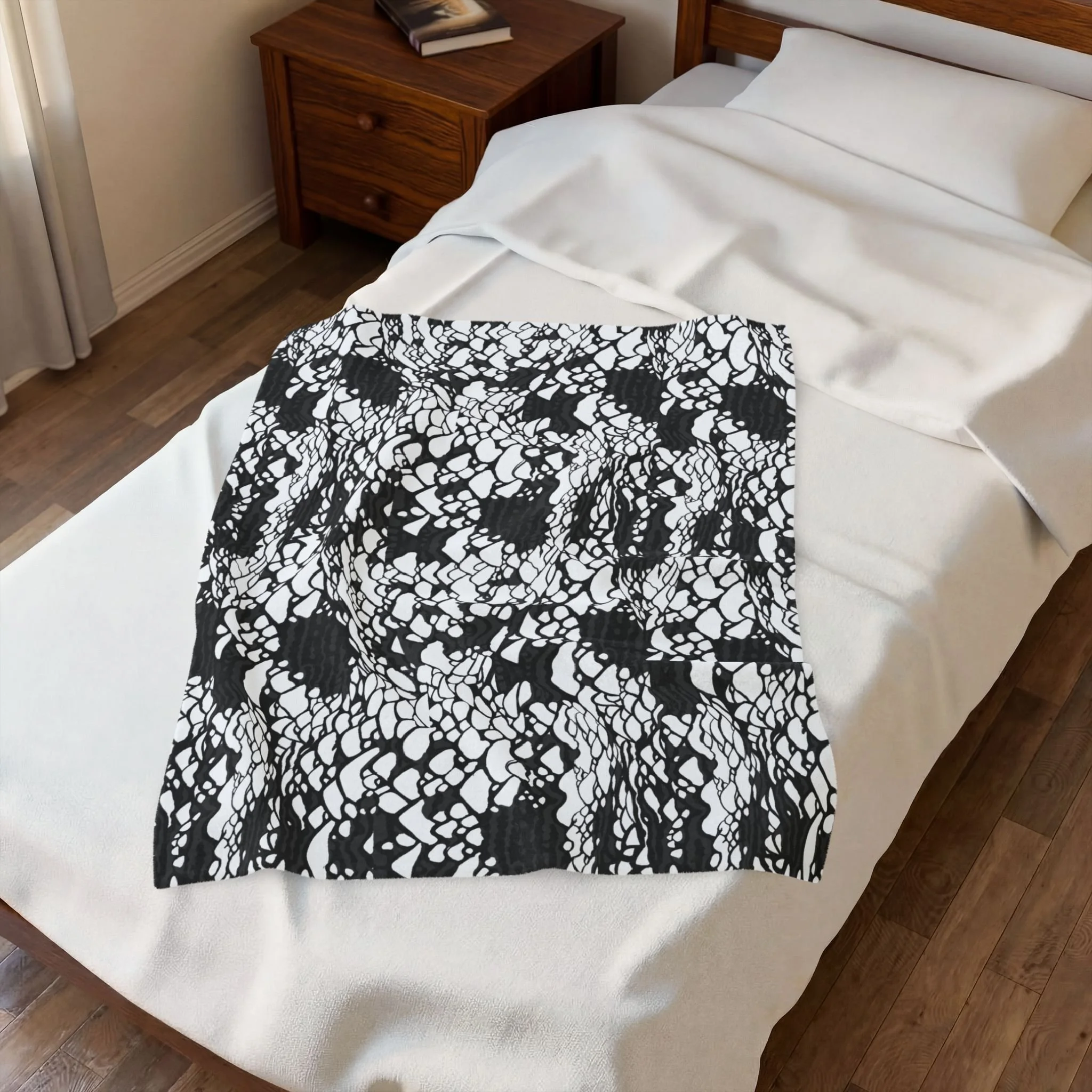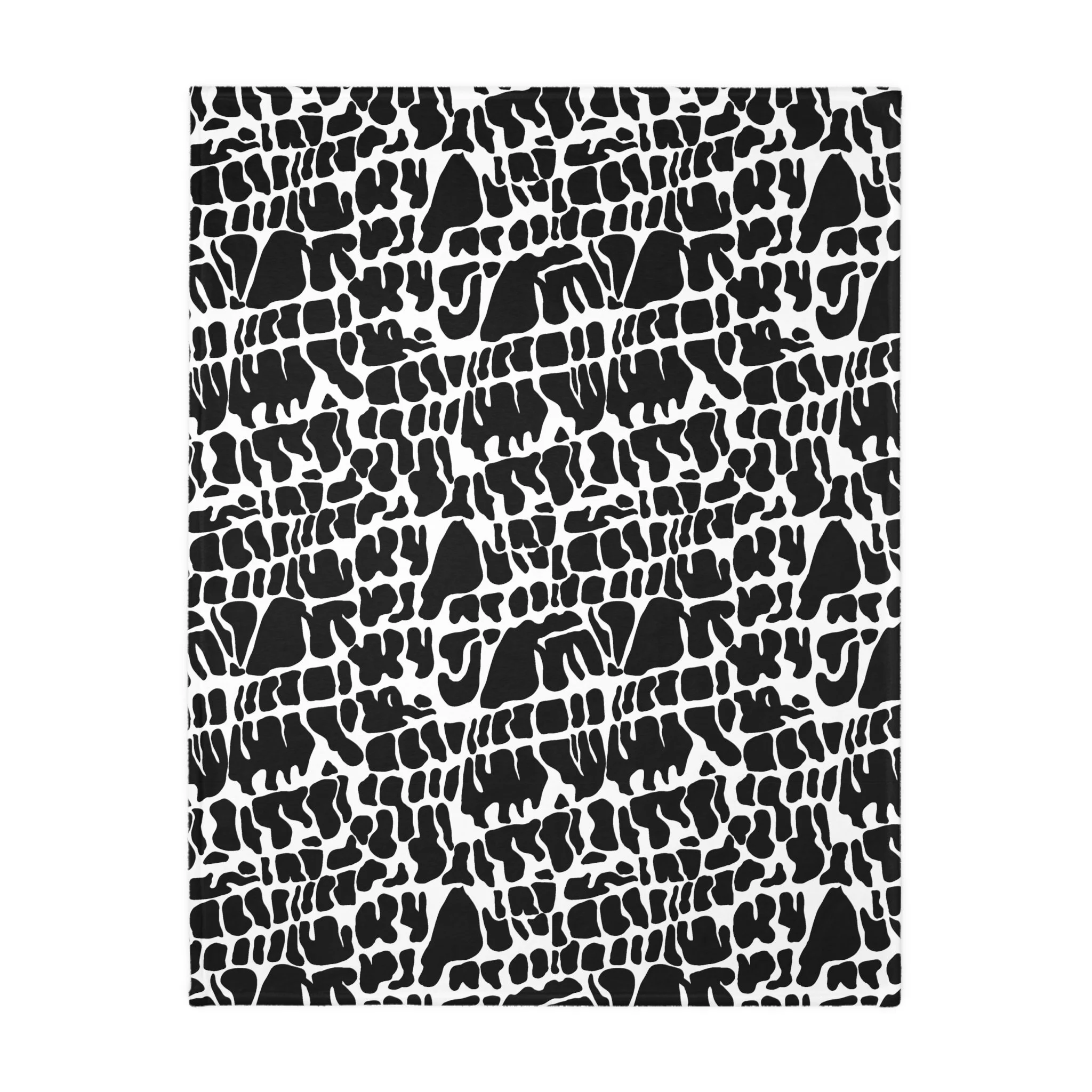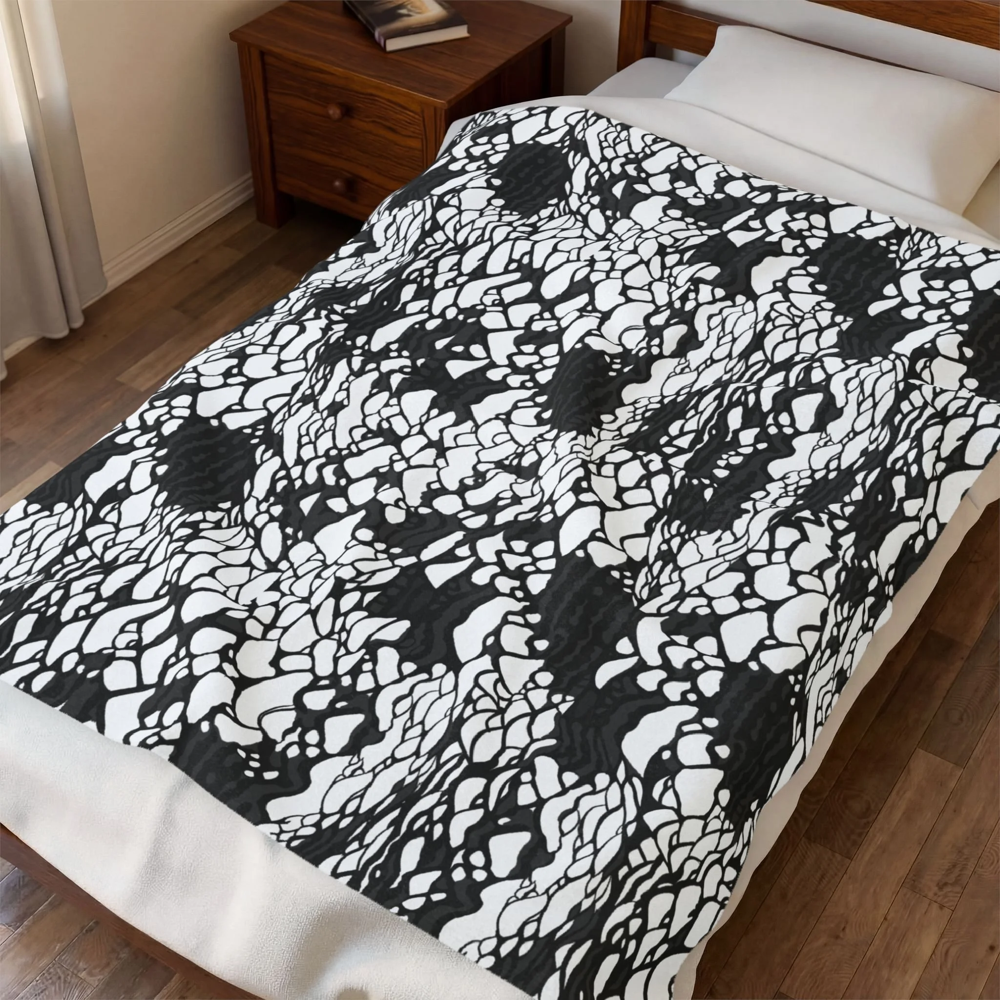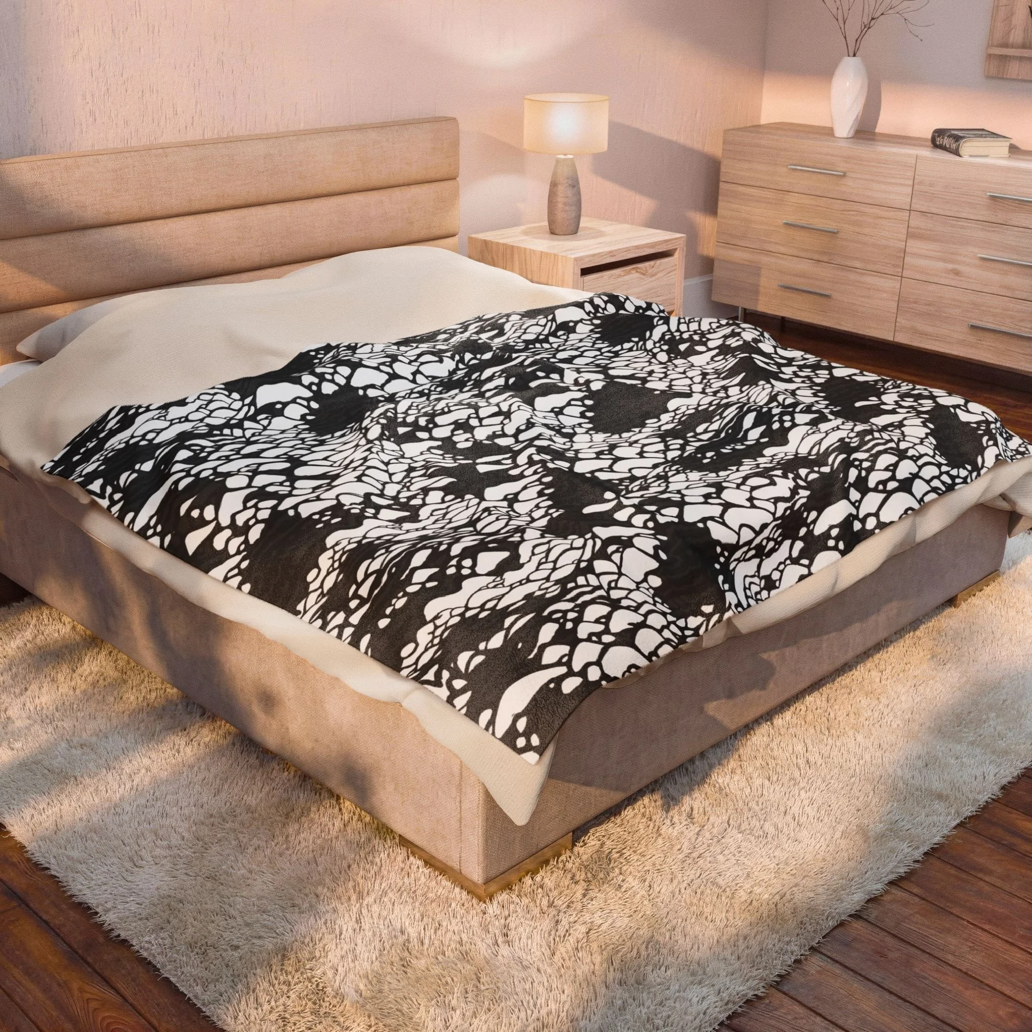 This plush velveteen microfiber blanket wraps a room in quiet, graphic calm. The two-sided print features an organic, black-and-white lace-like pattern—at once modern and slightly bohemian—so it reads as texture from across the room and reveals intricate marks up close. Lightweight yet cozy, the blanket drapes over sofas, folds into reading nooks, or layers at the foot of a bed to add contrast and subtle movement to neutral decor. It’s designed for everyday use: the hemmed edges and stitched border keep the shape tidy, while the soft, velvety face invites lingering and slow moments with a book or morning coffee.