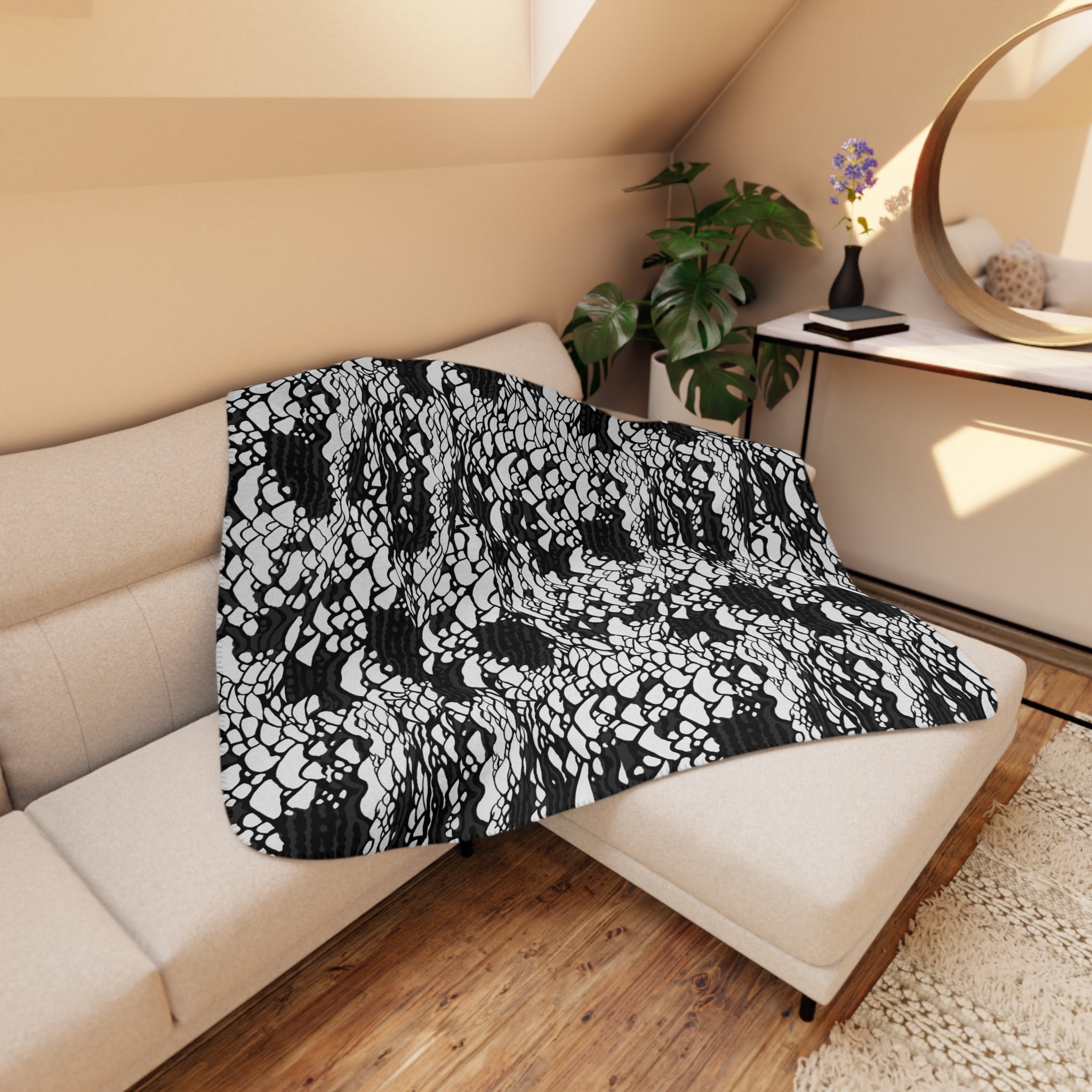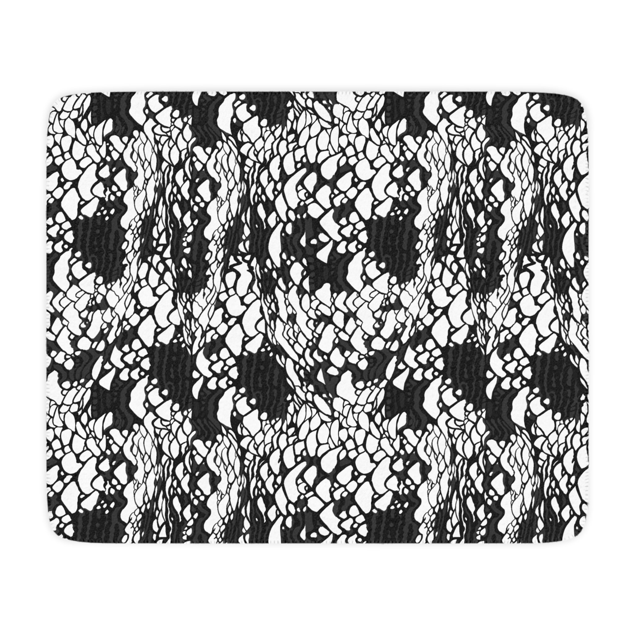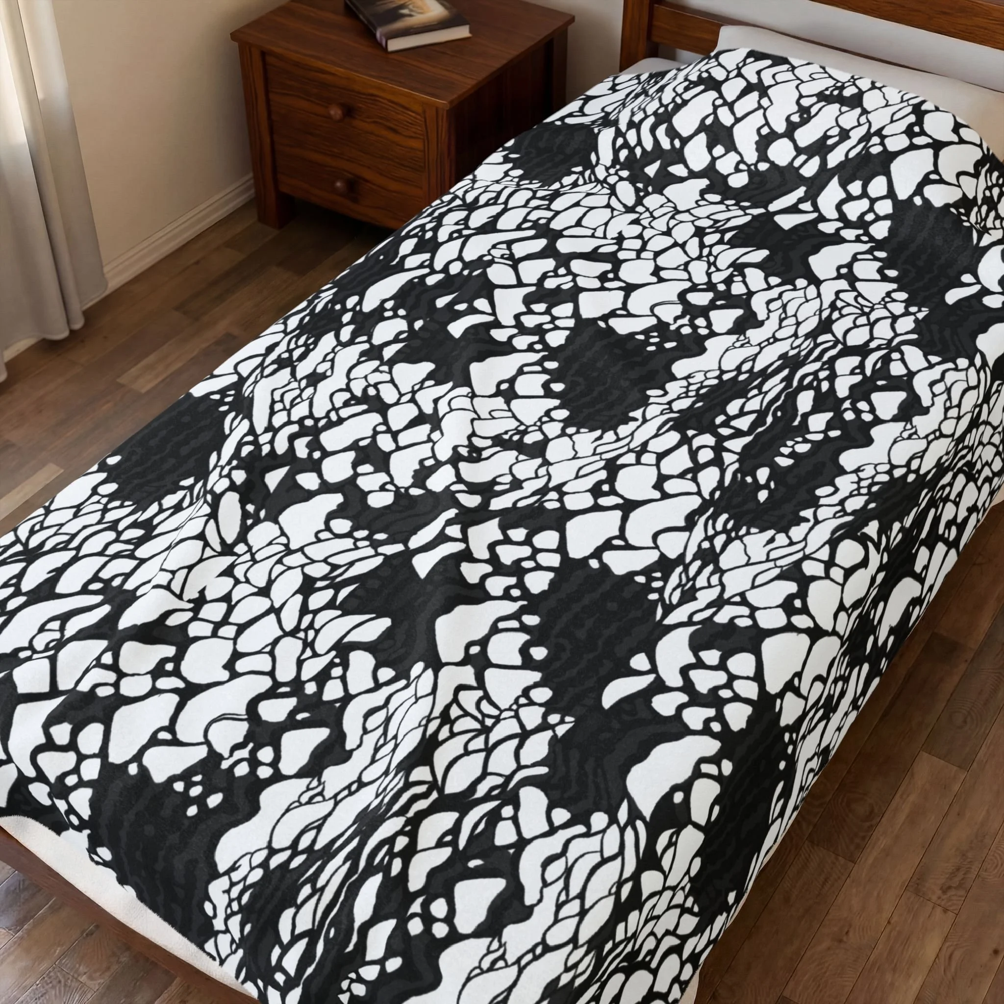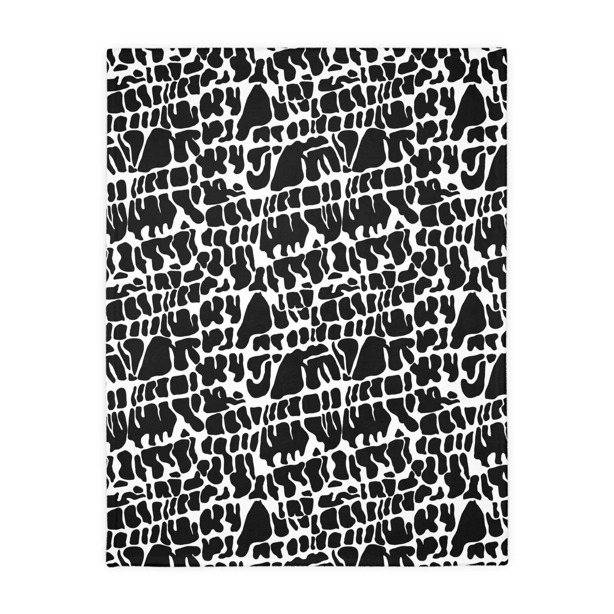 This plush velveteen microfiber blanket wraps a room in quiet, graphic calm. The two-sided print features an organic, black-and-white lace-like pattern—at once modern and slightly bohemian—so it reads as texture from across the room and reveals intricate marks up close. Lightweight yet cozy, the blanket drapes over sofas, folds into reading nooks, or layers at the foot of a bed to add contrast and subtle movement to neutral decor. It’s designed for everyday use: the hemmed edges and stitched border keep the shape tidy, while the soft, velvety face invites lingering and slow moments with a book or morning coffee.
