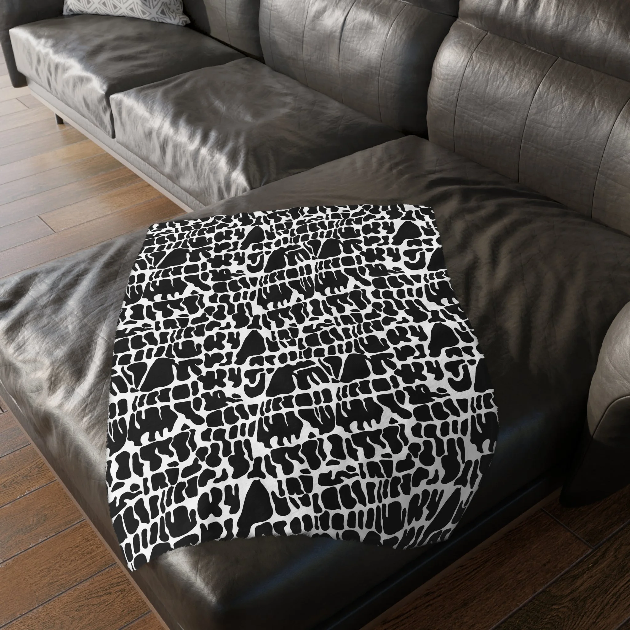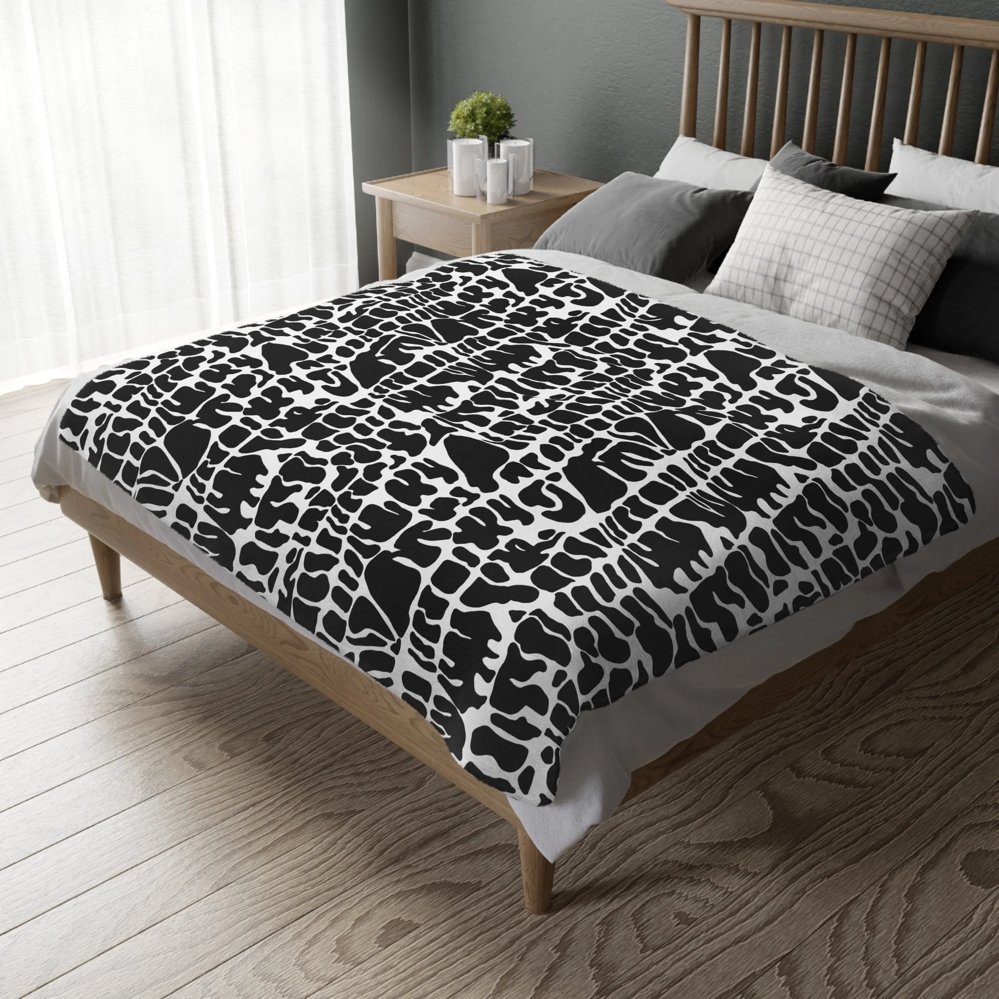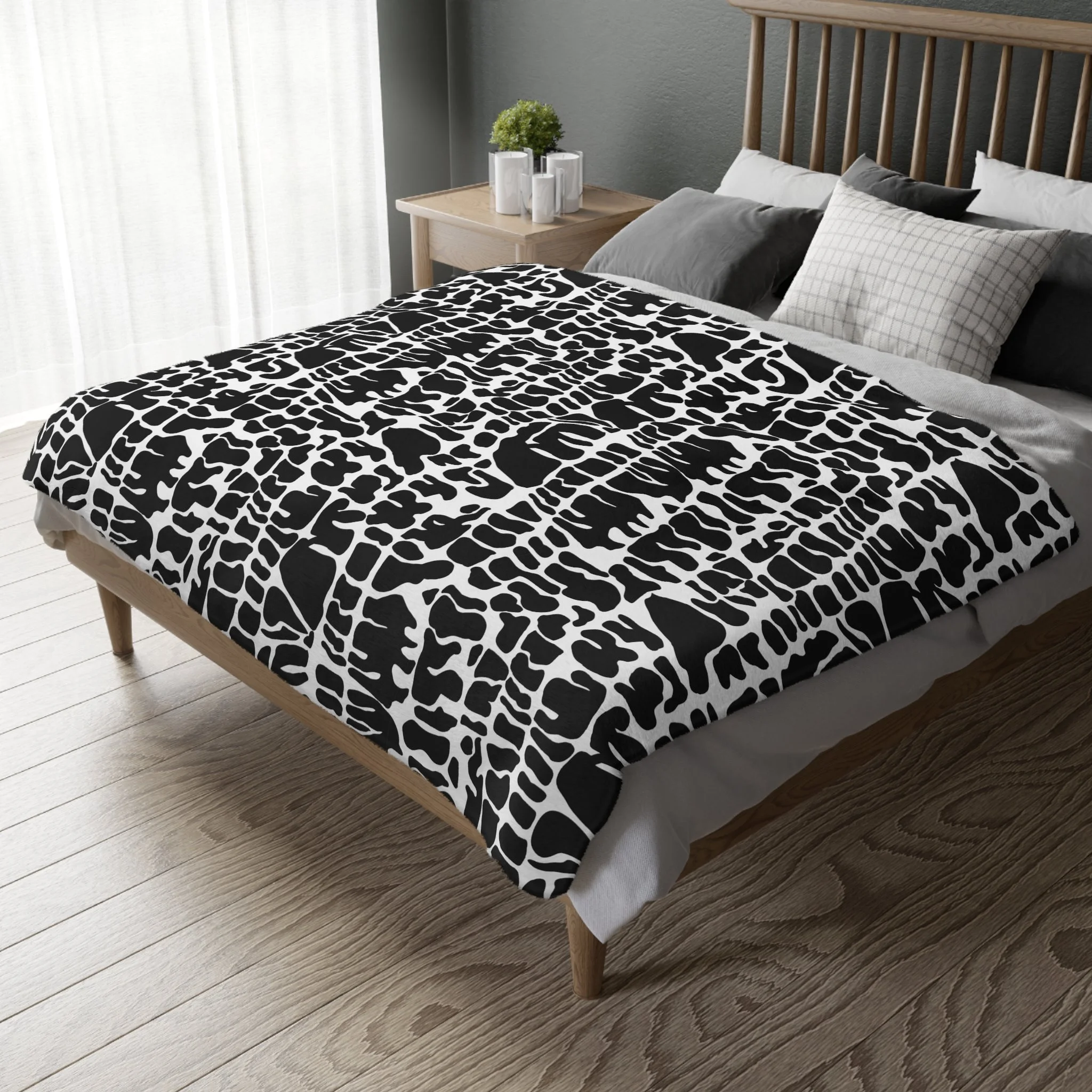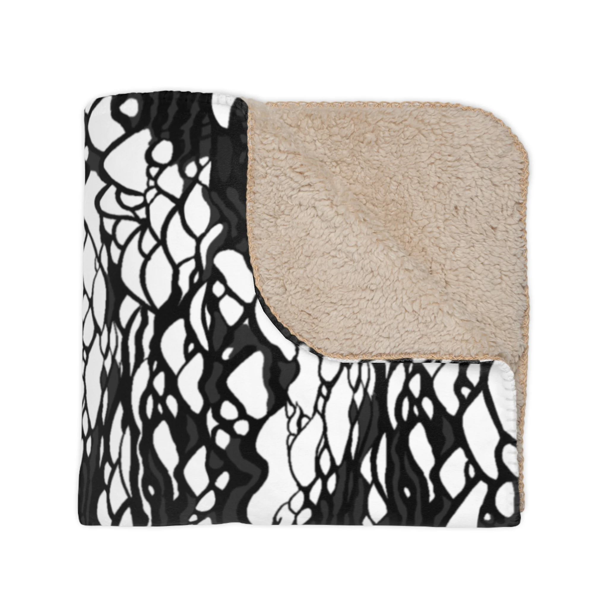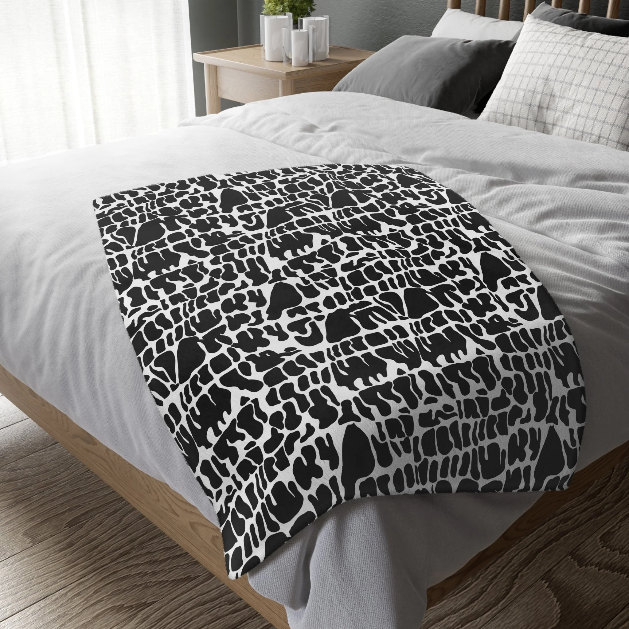 This plush velveteen microfiber blanket wraps a room in quiet, graphic calm. The two-sided print features an organic, black-and-white lace-like pattern—at once modern and slightly bohemian—so it reads as texture from across the room and reveals intricate marks up close. Lightweight yet cozy, the blanket drapes over sofas, folds into reading nooks, or layers at the foot of a bed to add contrast and subtle movement to neutral decor. It’s designed for everyday use: the hemmed edges and stitched border keep the shape tidy, while the soft, velvety face invites lingering and slow moments with a book or morning coffee.