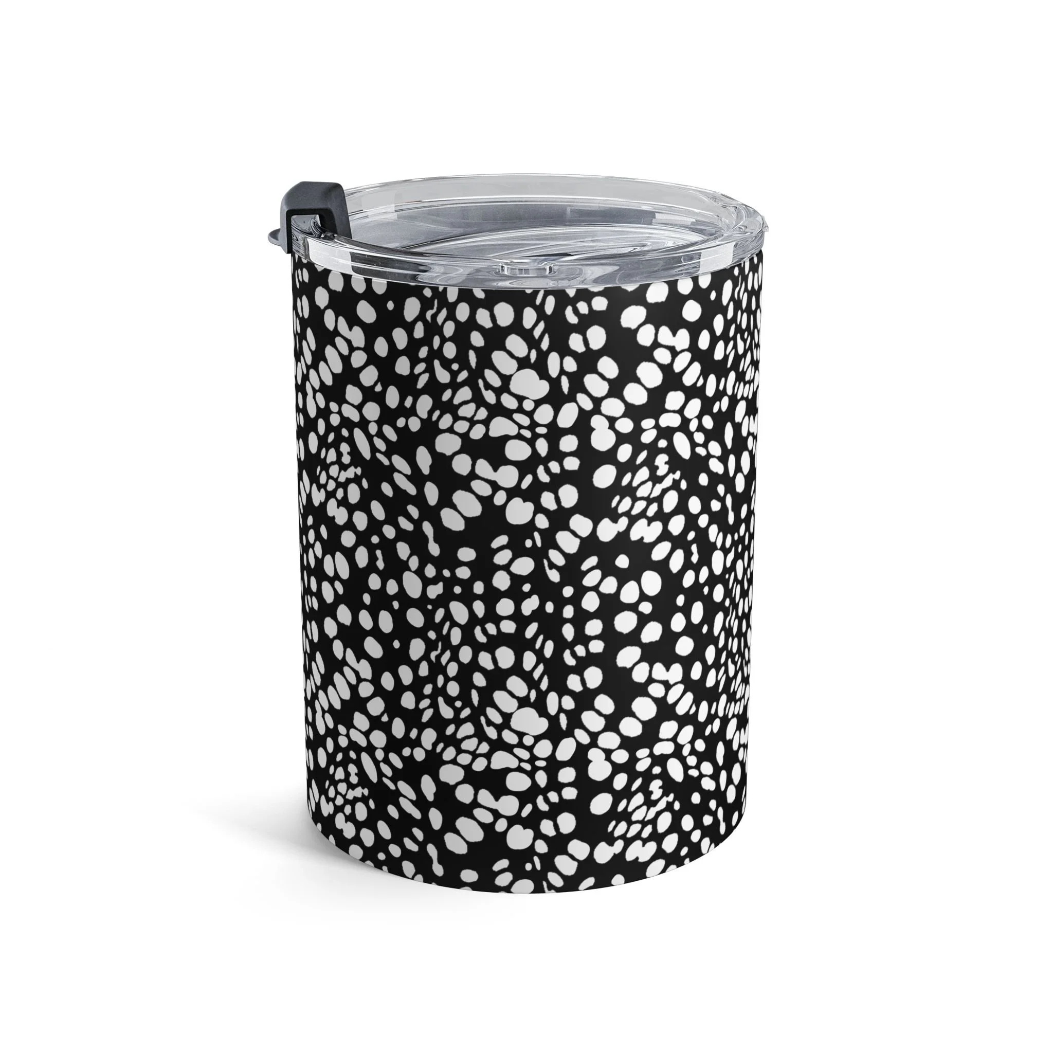 This 10oz stainless steel tumbler carries a bold black-and-white pattern that reads like hand-drawn lace or inked pebble textures. It feels compact in hand — a little daily companion that keeps your coffee warm through morning pages and your cold drinks crisp on a midday walk. The clear push-on lid with rubber gasket seals in temperature and minimizes spills, while the rounded edges and slim profile slip easily into small bags and tote pockets. It’s for people who savor quiet rituals: sketchers, commuters with an eye for monochrome design, and anyone who likes their carry to be both functional and visually distinct. Use it during early studio mornings, on crowded transit rides, or as a calm presence on your home desk.